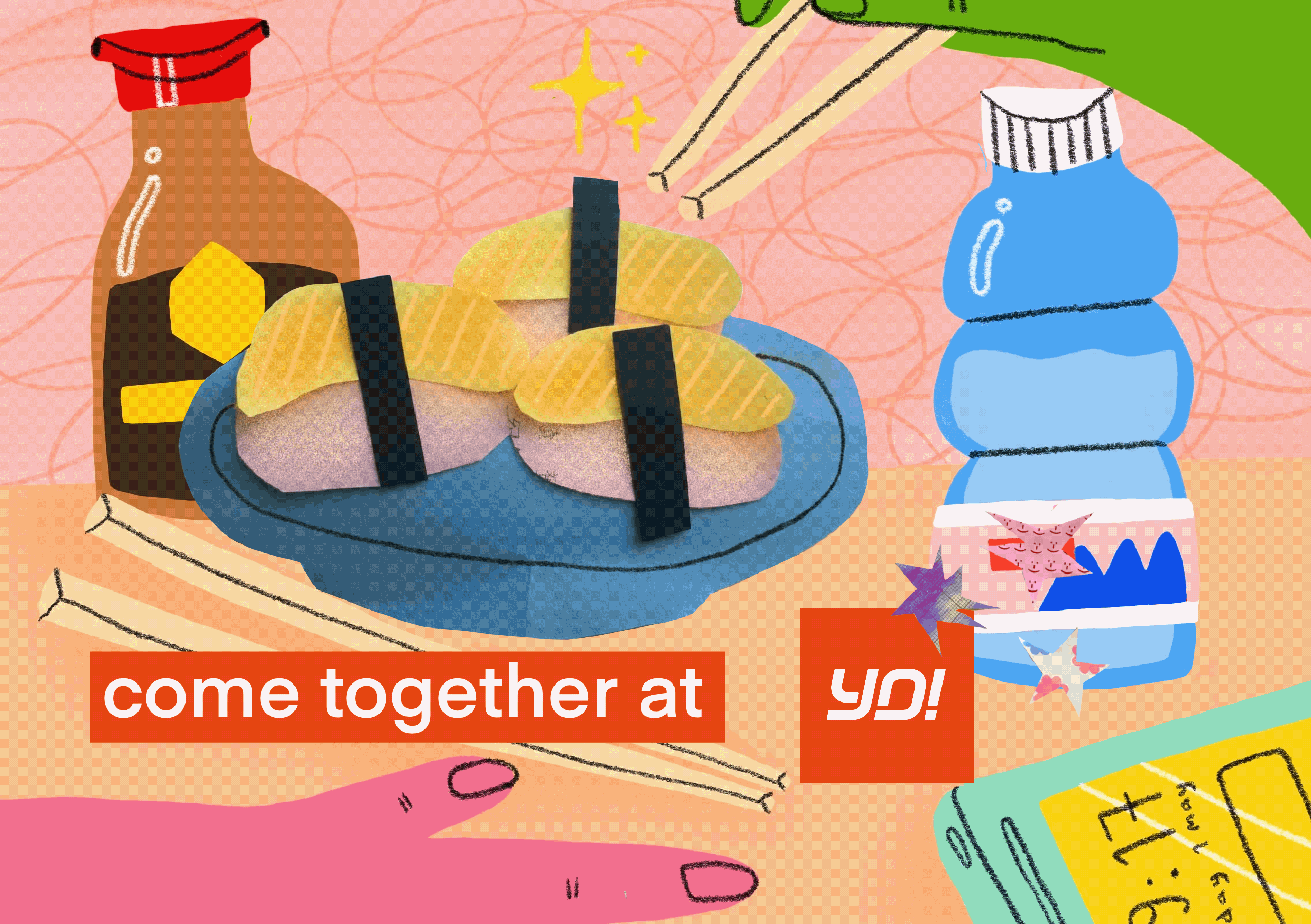 Meeting up with friends and reconnecting over a bite to eat, particularly sushi, is something I love doing so I aimed to reflect this in the work. After the 2020 lockdown I aimed to encourage people to come to Yo Sushi and reunite with loved ones over a tasty plate of the good stuff.
